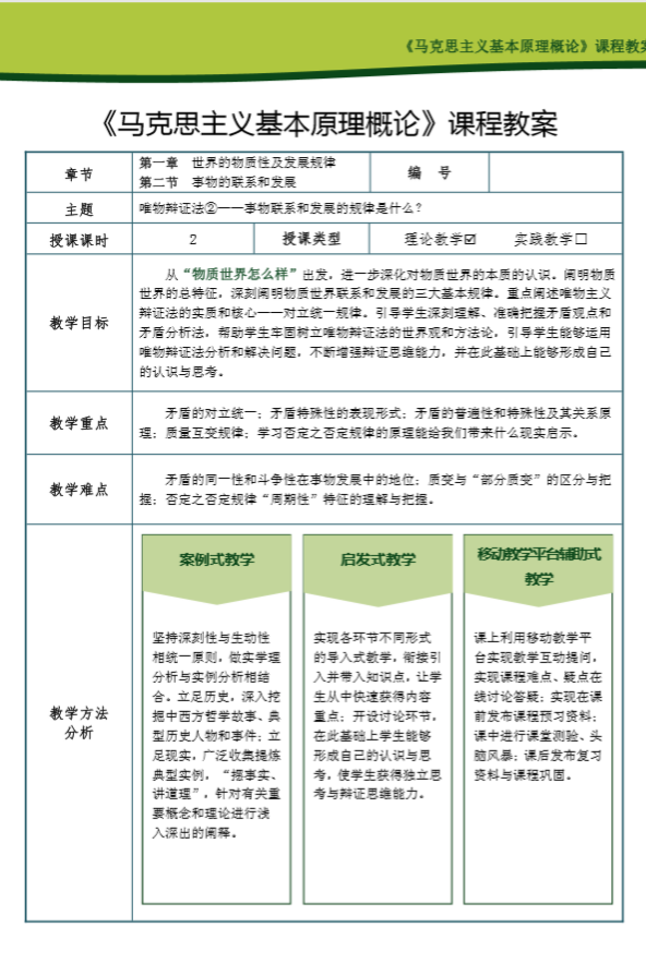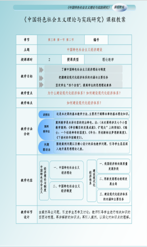 精心组织,教师们齐心协力,从教案内容的撰写和修订,到教案格式的设计与制作,反复推敲,数易其稿,锲而不舍,精益求精,直至7门课程都制作出了精美的参赛教案。所参赛的7门课程分别为:“马克思主义基本原理概论”“毛泽东思想和中国特色社会主义理论体系概论”“中国近现代史纲要”“思想道德修养与法律基础”“形势与政策”共5门本科生课程,以及“中国特色社会主义理论与实践研究”“中国马克思主义与当代”共2门研究生课程。
