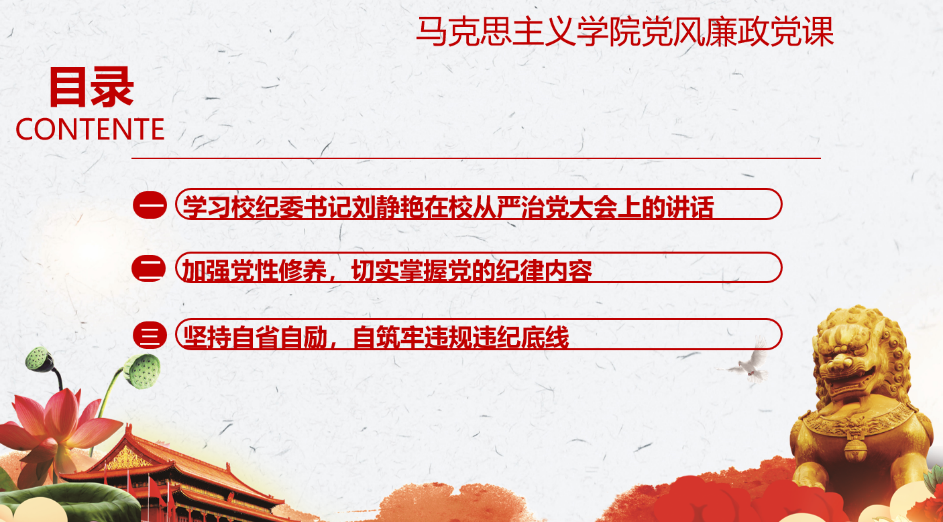 马文萍老师首先传达了刘静艳书记在2020年我校全面从严治党大会上的工作报告—《突出政治监督,加大执纪力度,为学校振兴发展提供坚强纪律保证》精神,结合我校2019年纪检工作情况,重点分析了管党治校、师德师风建设等方面存在的问题。为加强教师党员党性修养,做到引以为戒,马文萍老师带领大家学习了《中国共产党章程》中有关“党的纪律”内容,全面介绍了党的六大纪律要求,希望全体党员坚持自省自励,加强理论学习,主动接受监督,增强法纪意识,保持政治本色。