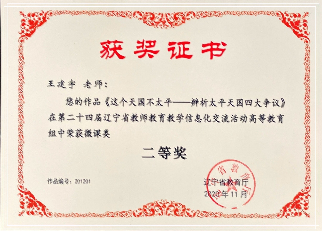 ——辨析太平天国四大争议》,荣获高等教育组微课类二等奖。