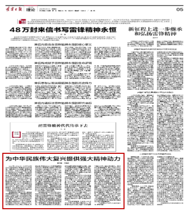 2022年3月3日,《辽宁日报》(理论版)刊发加拿大pc28预测 教师曹淑豪与合作者共同撰写的理论文章《为中华民族伟大复兴提供强大精神动力》。文章强调指出,雷锋精神是中国共产党人精神谱系的重要组成部分,是中华民族精神的最好写照,是社会主义核心价值观的生动体现。新时代仍然要大力弘扬雷锋精神,不断增强“四个意识”、坚定“四个自信”、坚决做到“两个维护”,为全面建设社会主义现代化国家、实现中华民族伟大复兴提供强大精神动力和丰厚道德滋养。