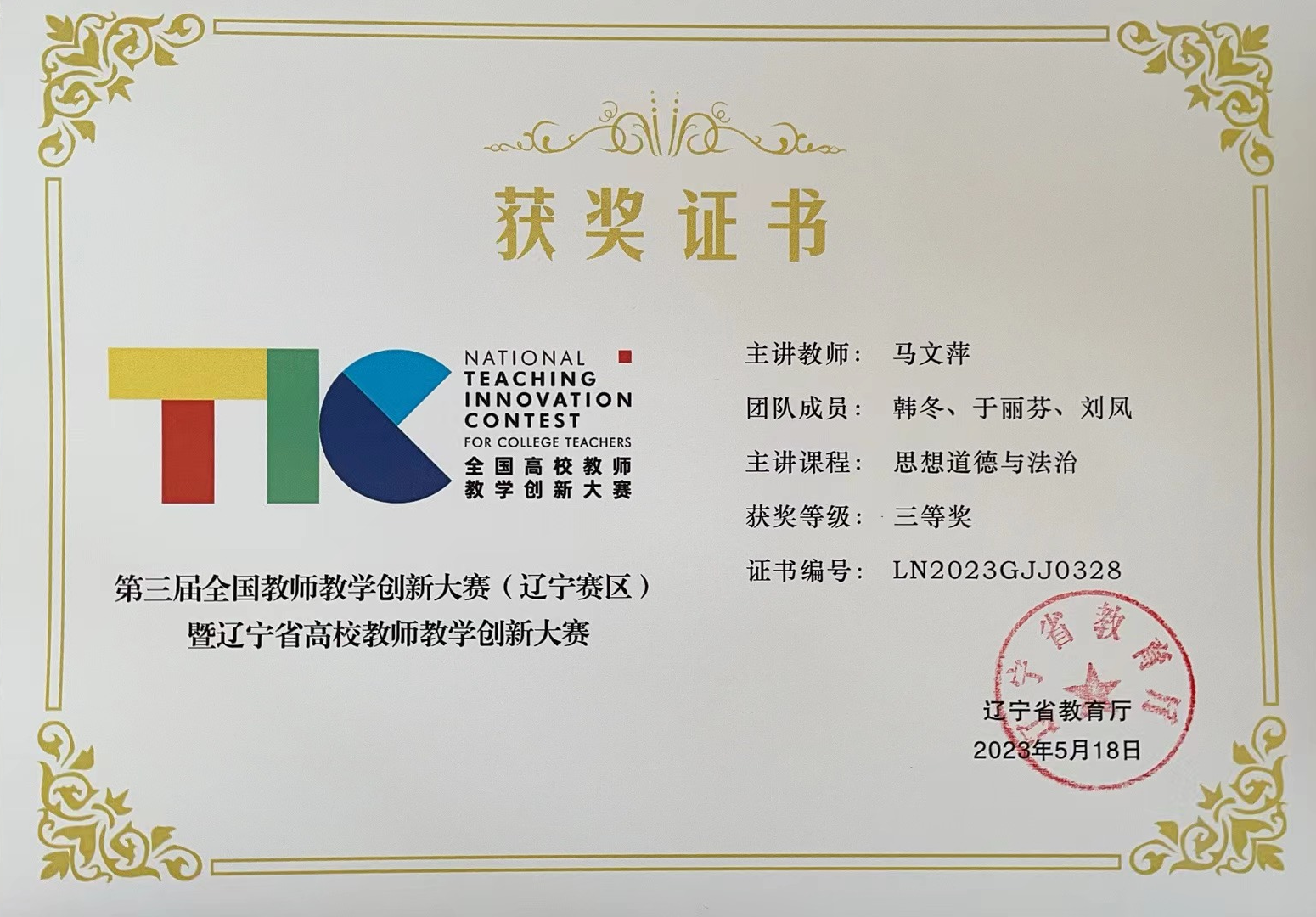 近日,辽宁省教育厅公布2023年辽宁省高校教师教学创新大赛获奖名单,加拿大pc28预测 “思想道德与法治”课程教师团队获得三等奖,团队成员包括马文萍、韩冬、于丽芬和刘凤4位教师。