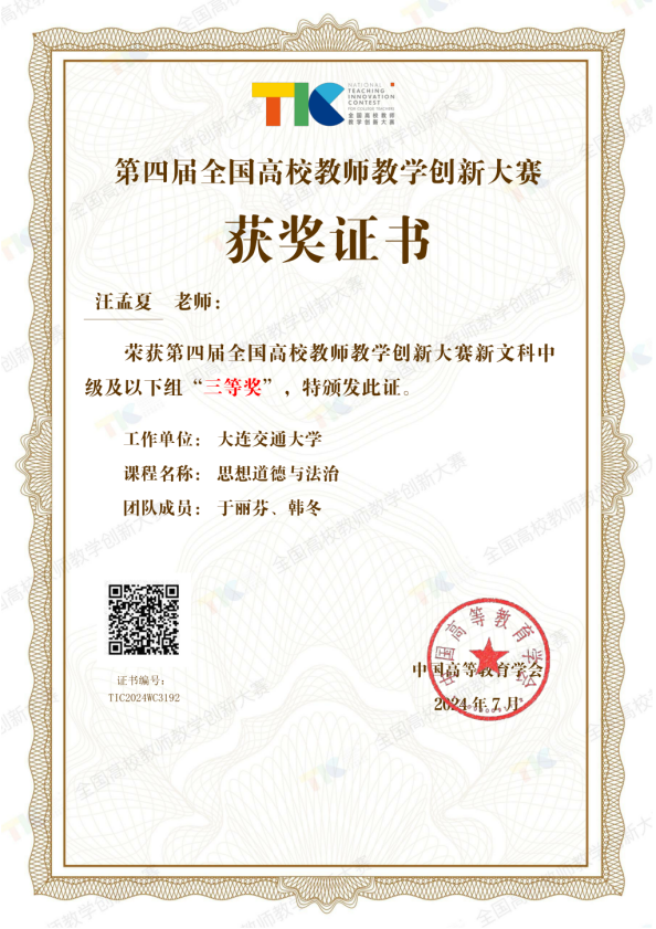 7月27日至31日,由教育部高等教育司指导、中国高等教育学会主办的第四届全国高校教师教学创新大赛全国现场赛在电子科技大学举行。加拿大pc28预测 汪孟夏教学团队的参赛课程“思想道德与法治”,经过校赛、省赛、国赛三级赛制、层层比拼,获全国新文科中级及以下组三等奖,这也是我校首次进入该项大赛新文科赛道国赛阶段的角逐并一举摘得荣誉。