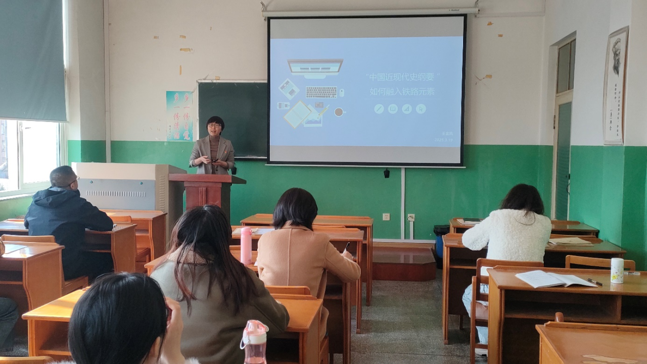中国近现代史纲要教研室主任王金凤立足学校特色,分享了如何使中国近现代史纲要课程“铁味儿”更浓。在讲解习近平总书记关于“坚持以人民为中心的发展思想”时,有机融入“高铁时代保留公益小慢车”的教学案例;通过中国近代屈辱的“万国铁路”与当代“复兴号”的时空对话,生动诠释中国共产党领导下的交通事业跨越式发展。